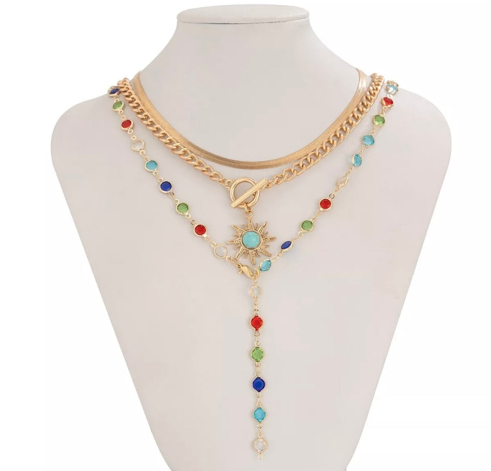 3 in 1 Necklace Multi Layer Sun Crystal Chain Choker Charm Pendant