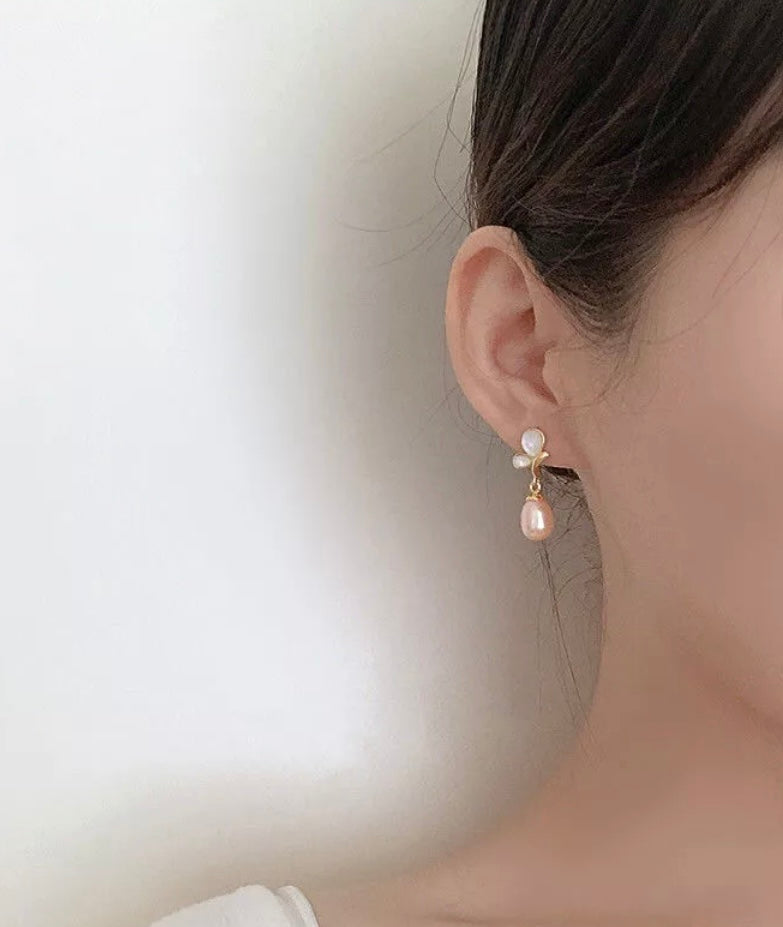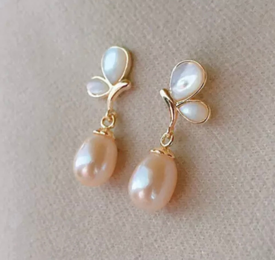 Silver Butterfly Pink Pearl Gold Drop Stud Earrings
