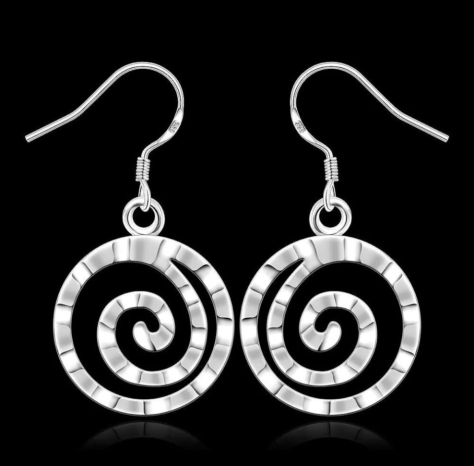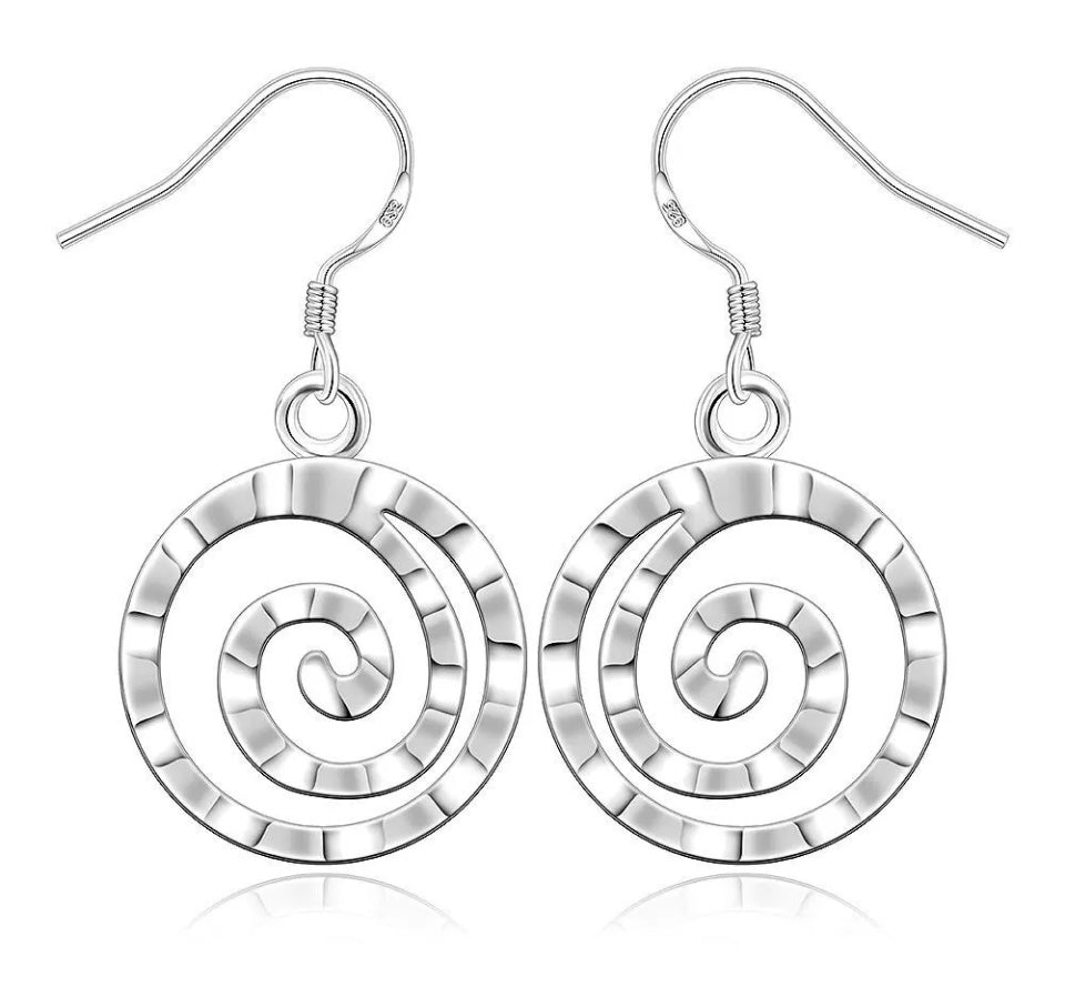 Silver Circle Earrings Drop Hammered Finish Spiral Dangle Gift Bag