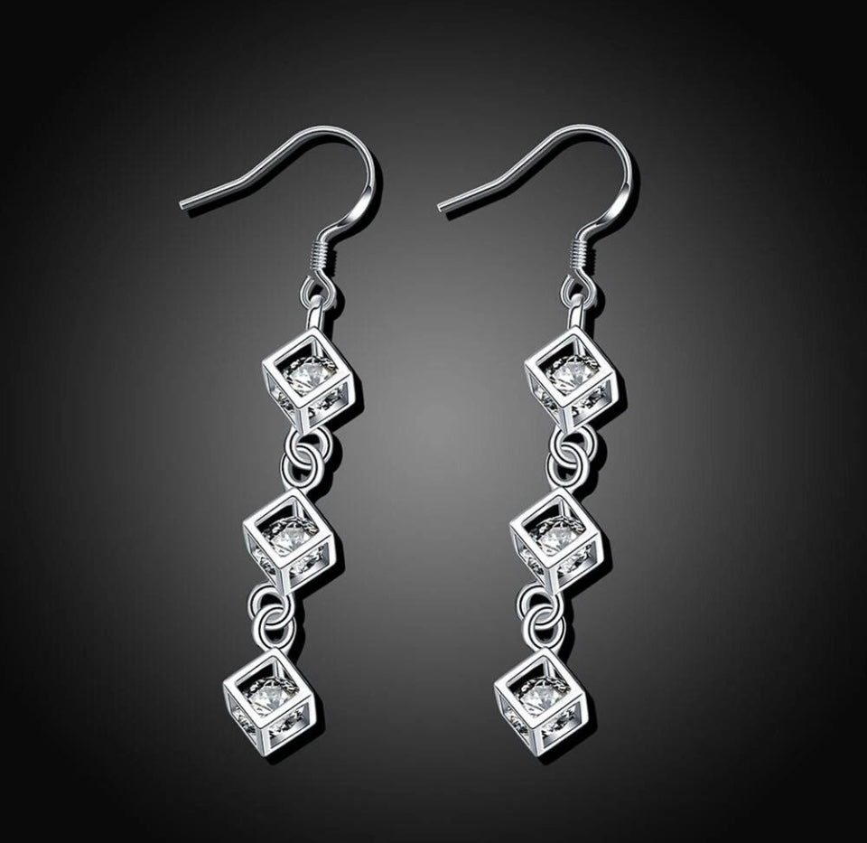 Silver Cube Earrings with Sparkling Crystals Drop Dangle Gift Bag