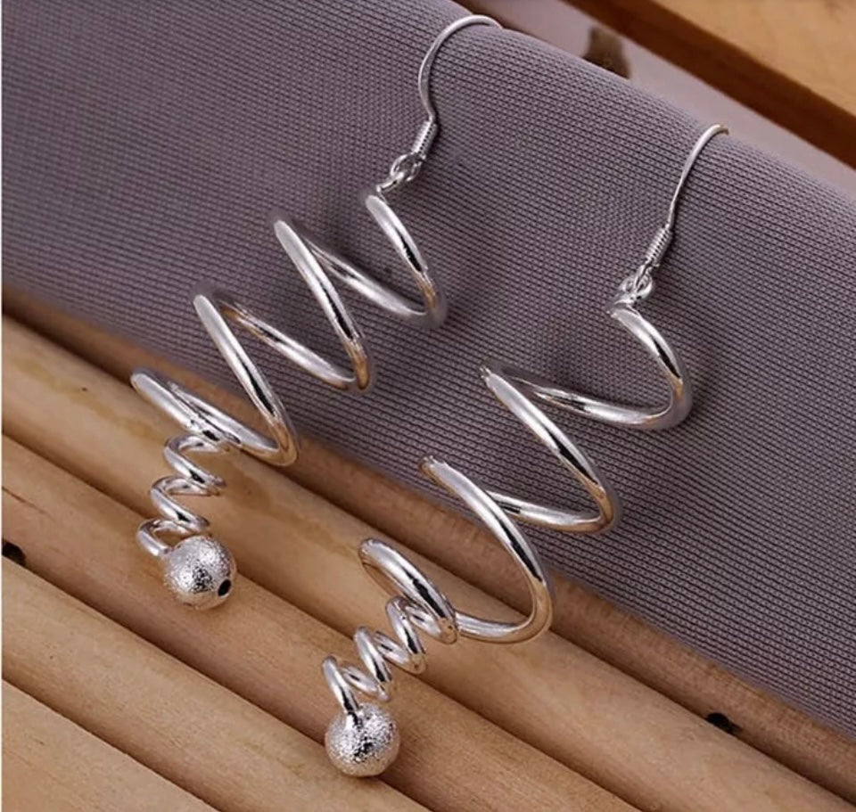 Silver Earrings Twist Swirl Spiral Dangle Drop & Ball Free Gift Bag