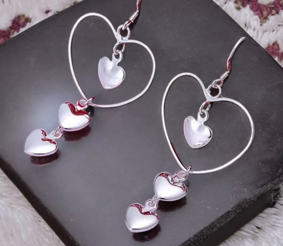Silver Heart Earrings Triple Heart Dangle Drop Love Free Gift Bag