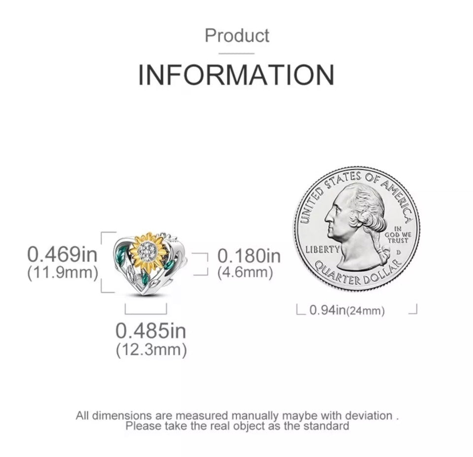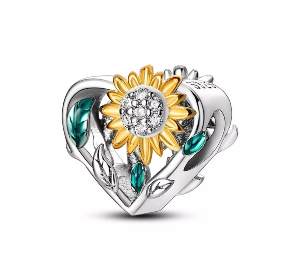 Blooming Sunflower Heart Charm For European Bracelets S925 Sterling Silver