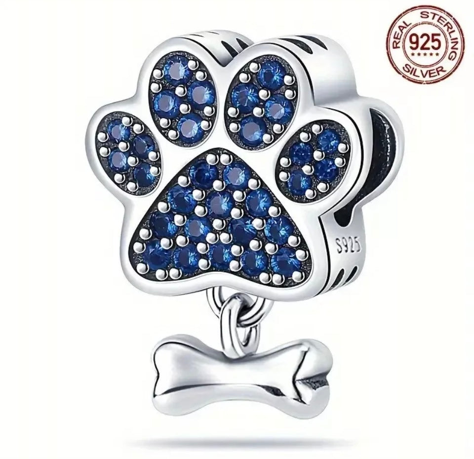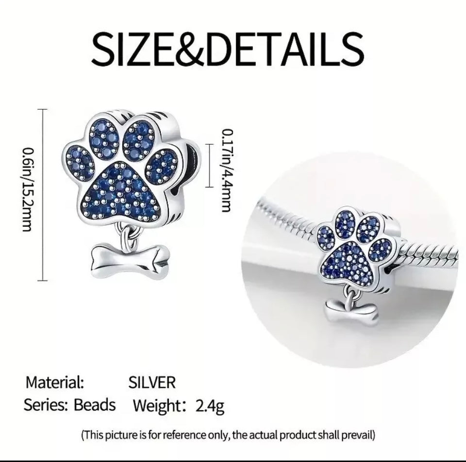Blue Paw Print & Dog Bone Charm For European Bracelets S925 Sterling Silver