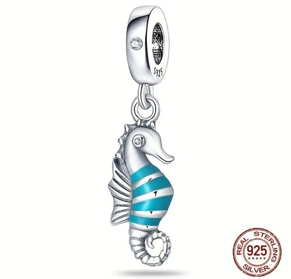 Blue Striped Seahorse Dangle Charm For European Bracelets S925 Sterling Silver