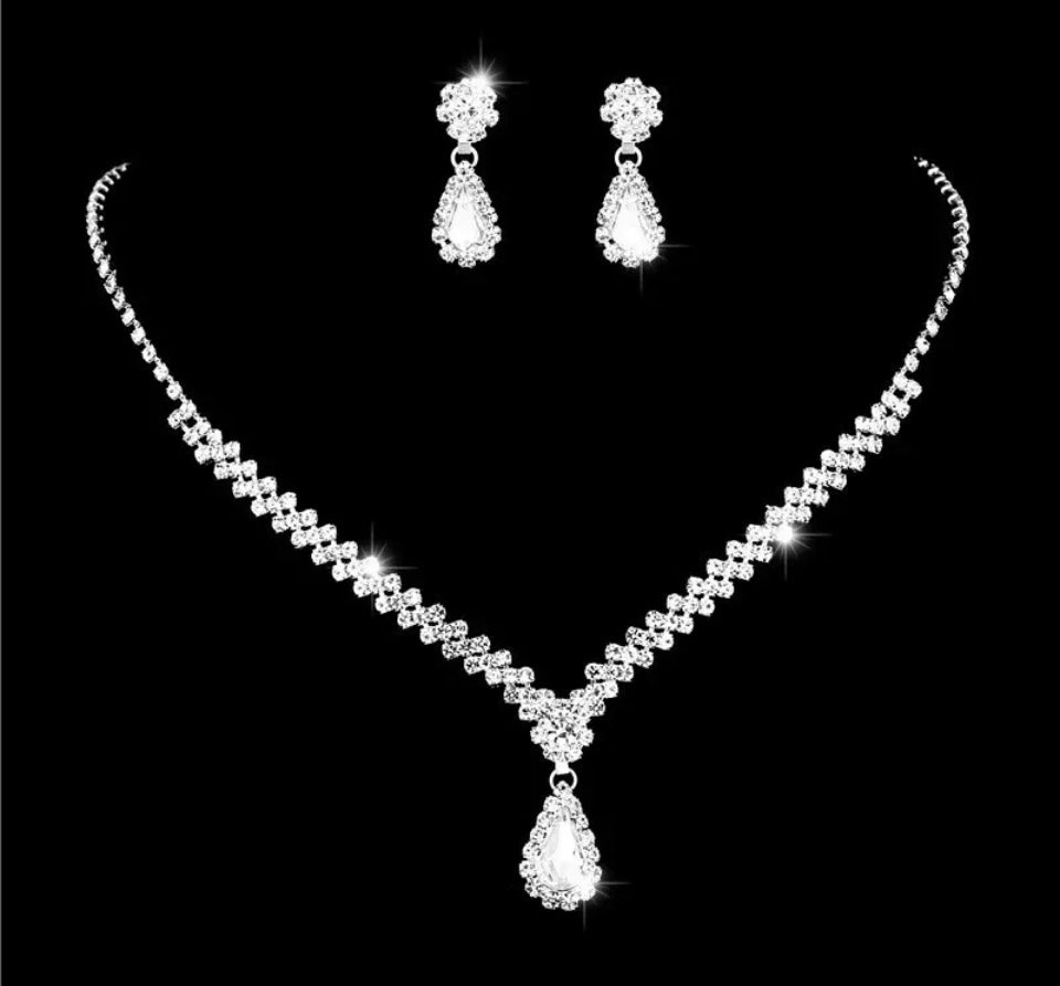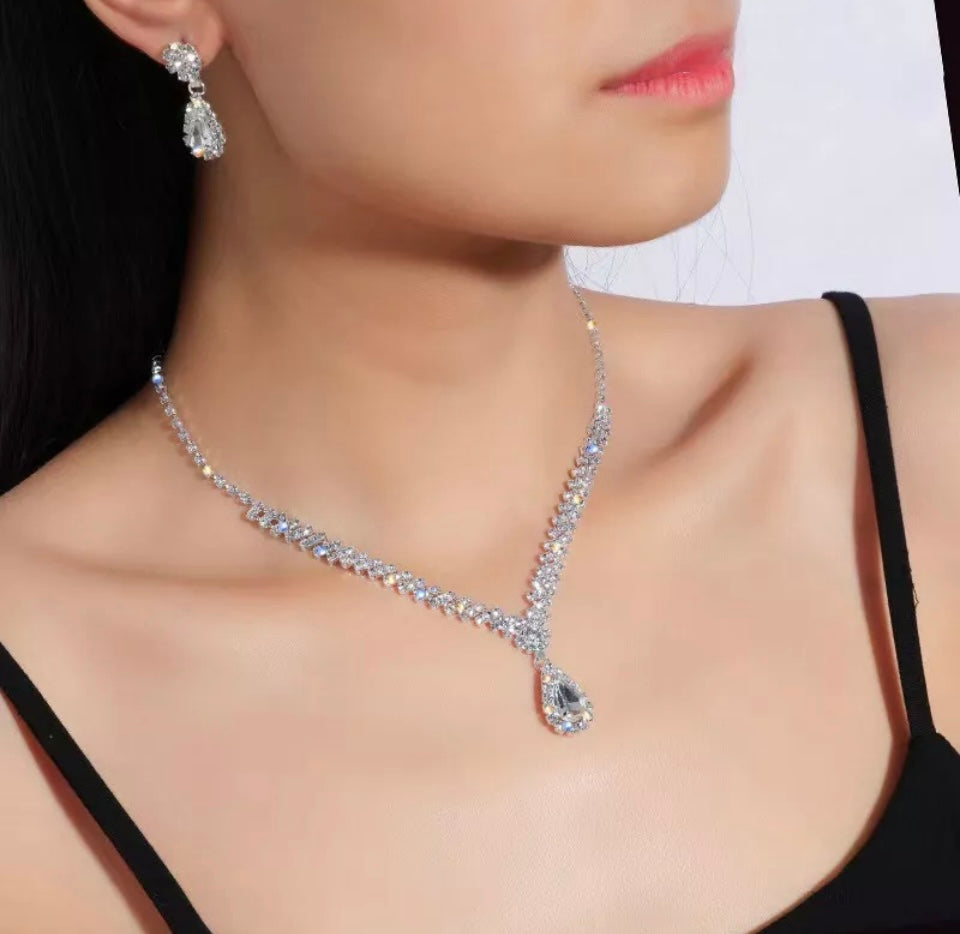 Costume Crystal Jewellery Set Gift for Her Wedding Silver Necklace Earrings