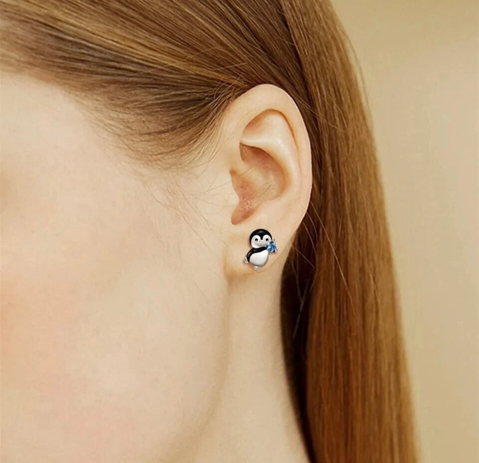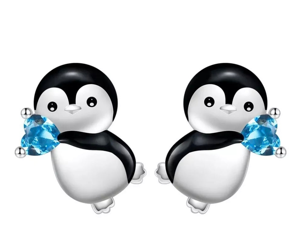 Cute Silver Baby Penguin Stud Earrings, Cubic Zirconia Heart Gem