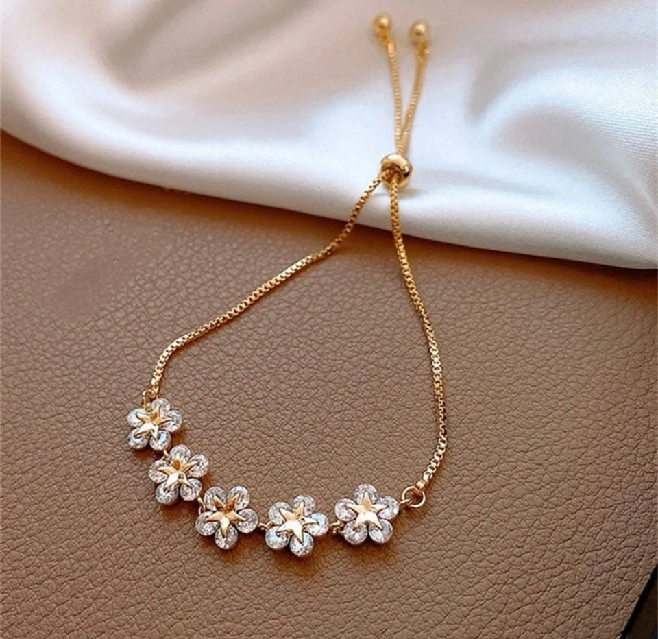 Gold Flower Bracelet Women – Adjustable Crystal Slider
