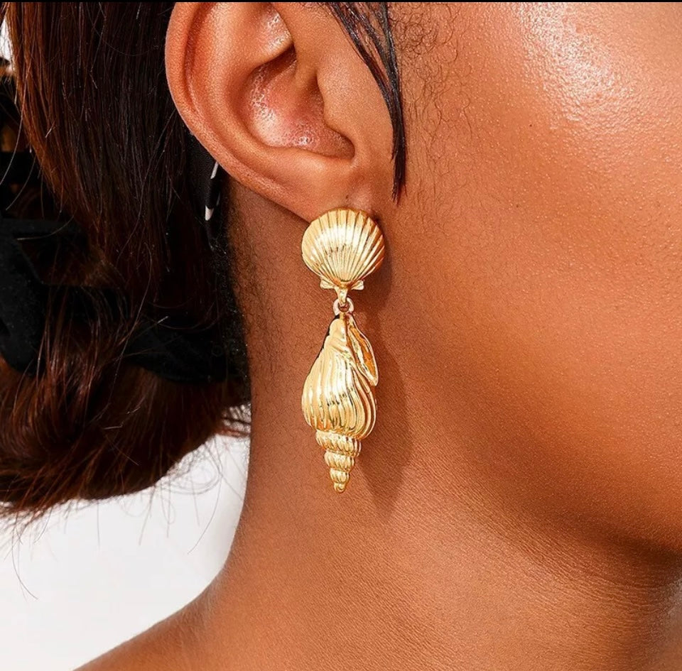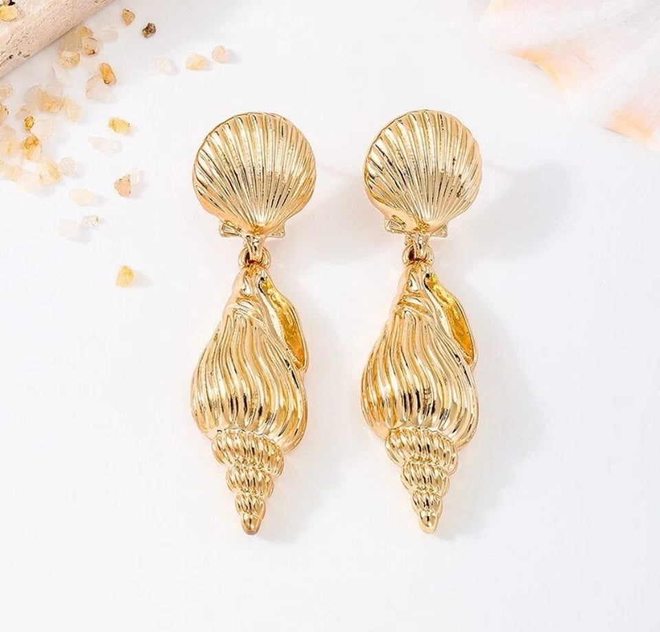 Gold Shell Holiday Beach Ring Drop Stud Earrings