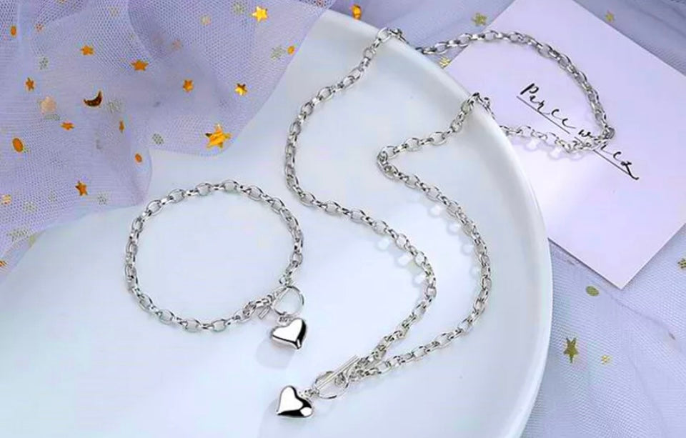 Heart Pendant Silver Plated Chain Necklace and Bracelet set