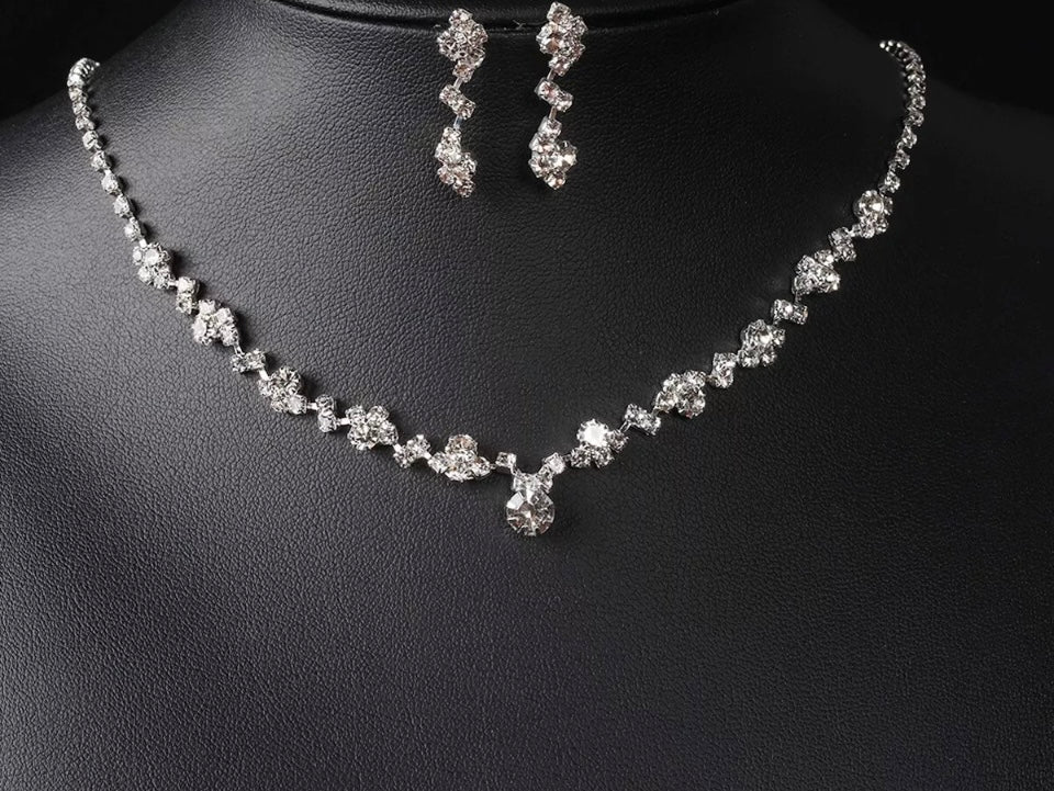 Silver Set Rhinestone Wedding Crystal Necklace Earrings Drop Dangle set