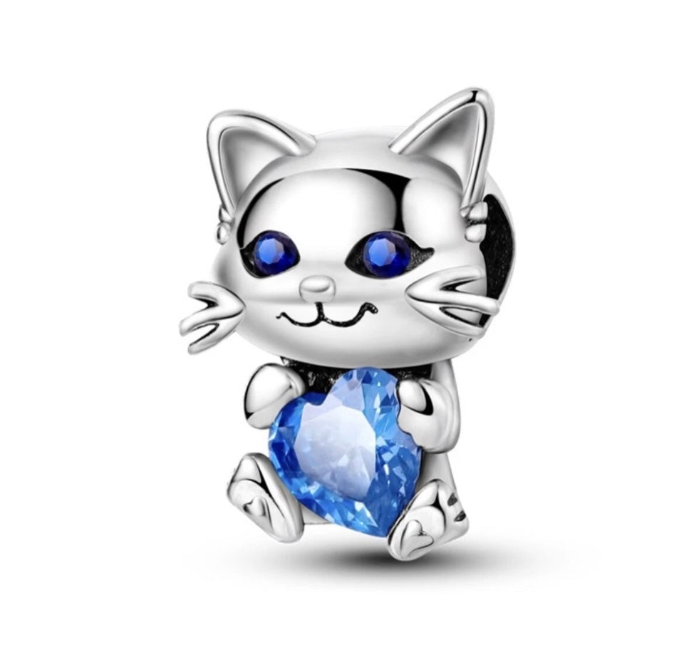Sterling Silver Cat With Blue Heart Charm, S925 Silver
