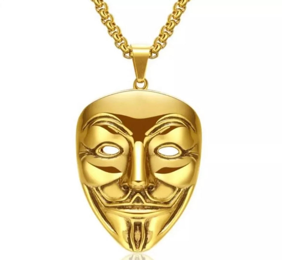 Vendetta Mask Pendant Guy Fawkes Gold Necklace Gothic Biker